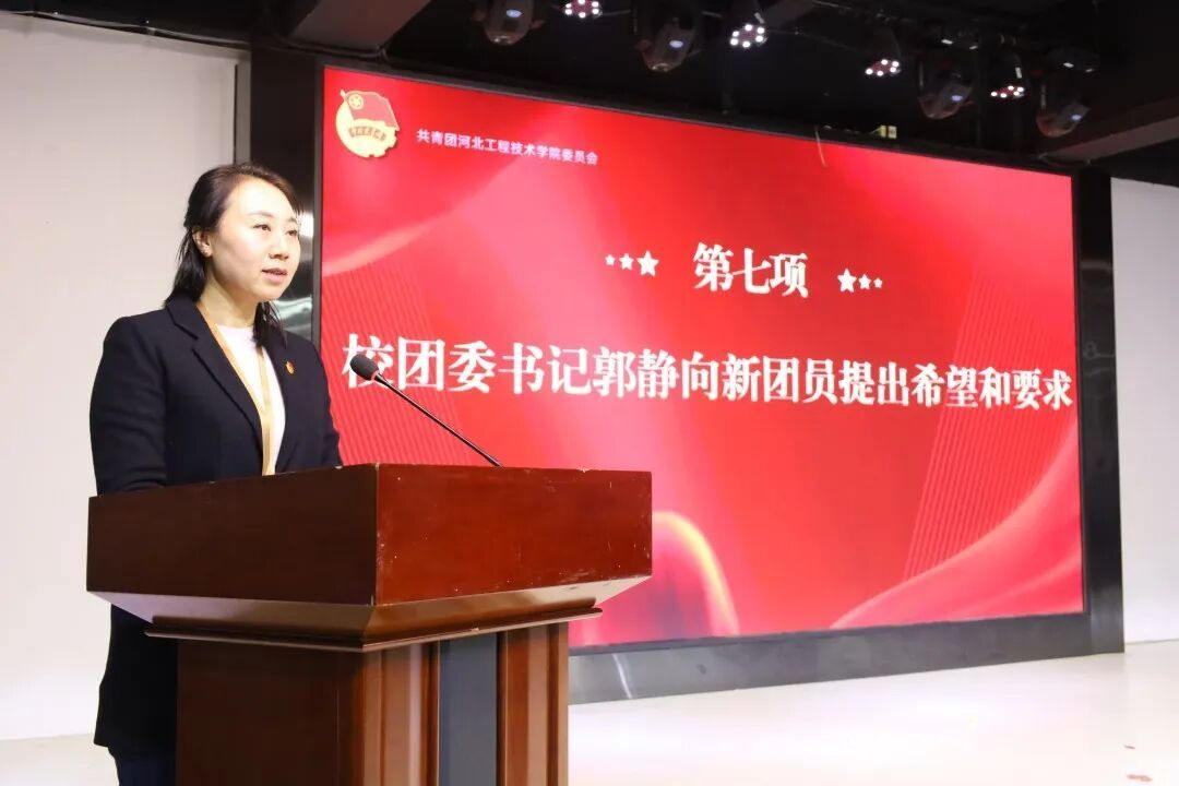 校团委书记郭静在讲话中首先向全体新团员表示祝贺。她回顾了一年来学校共青团在思想引领、组织建设、文化育人、实践服务等方面的工作,并充分肯定了广大团员青年的积极作用。